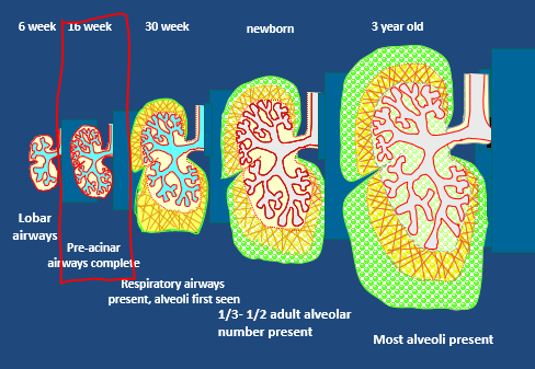 Branching morphogenesis of airways develops into mesenchyme (embryonic tissue which develops into connective and skeletal tissue). Pre-acinar (acinar denotes regions of the lung supplied with air from bronchioles) airways are all present by 17 weeks. Development of cartilage, glands and smooth muscles continues into the canalicular phase.