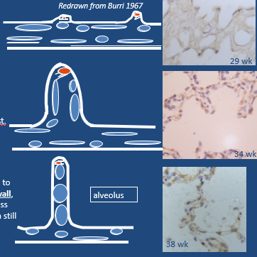 Small volume, all airways present and differentiated, with most arteries and veins present, but ONLY 33-50% OF ALVEOLI PRESENT.