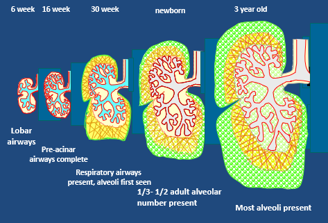 Children have very rapid alveolar repair and recovery than adults because alveoli growth continues into adolescence, so if children lose alveoli in disease, they have much greater capacity to recover than adults – who’s alveoli are not growing and increasing in number.