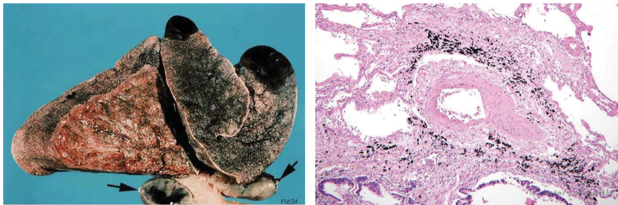 Inhalation of carbon dust. Macrophages eat the carbon, resulting in irregular black patches both grossly and histologically (see photo).