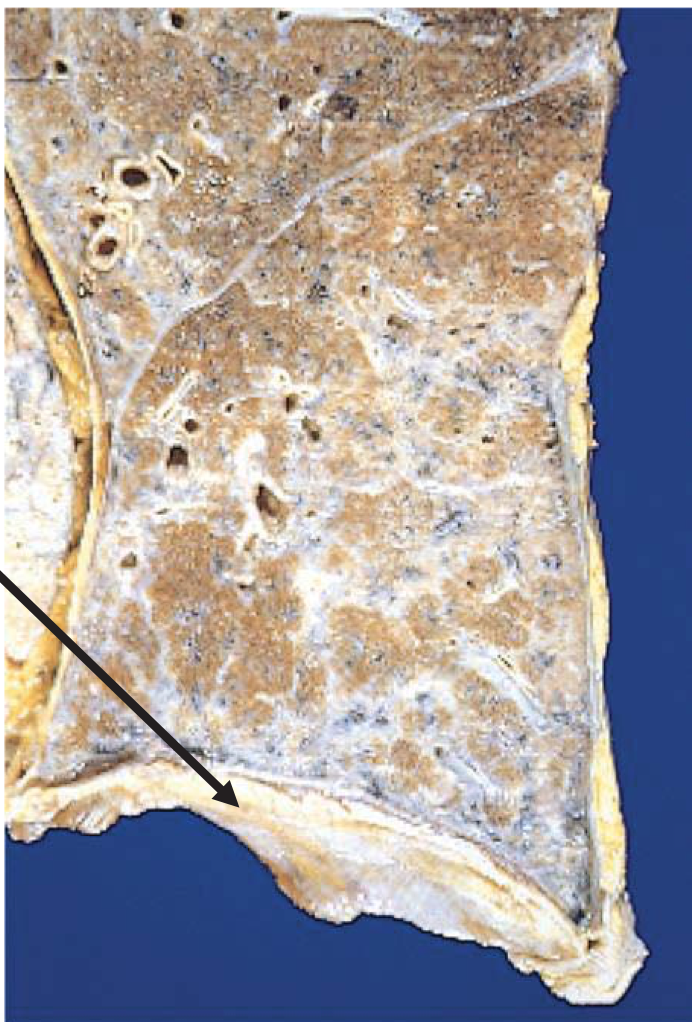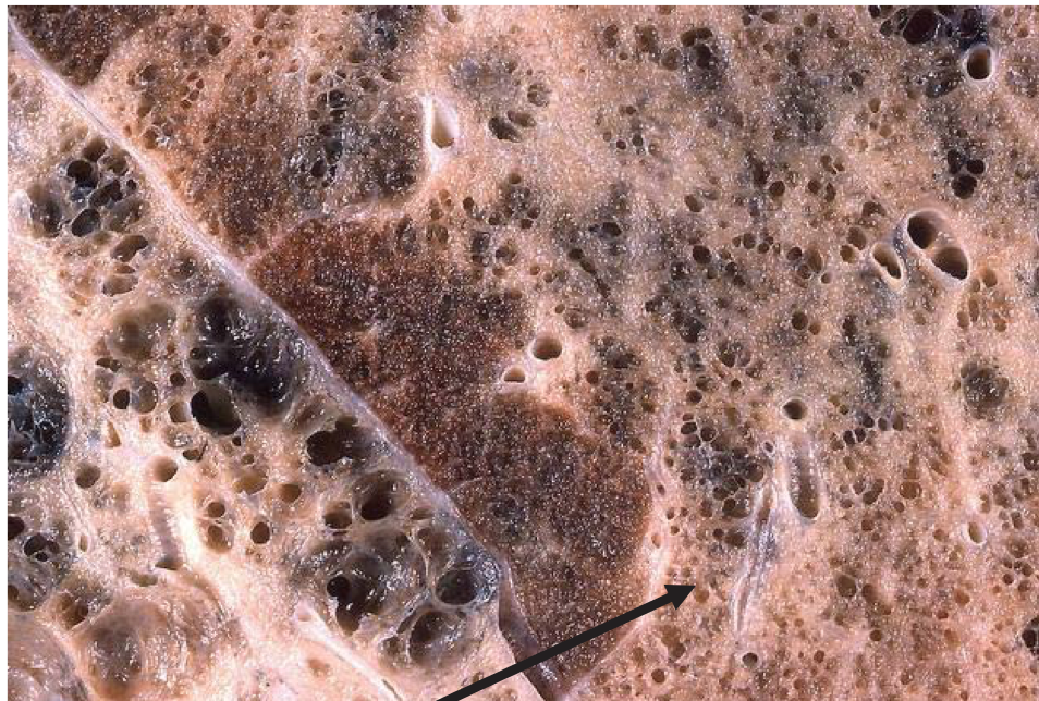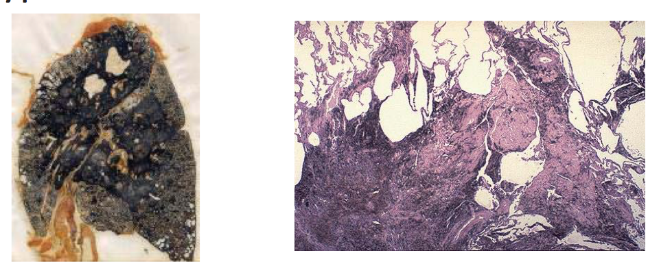Chronic silicosis - characterized by fibrotic nodules that enlarge and block airways and blood vessels.