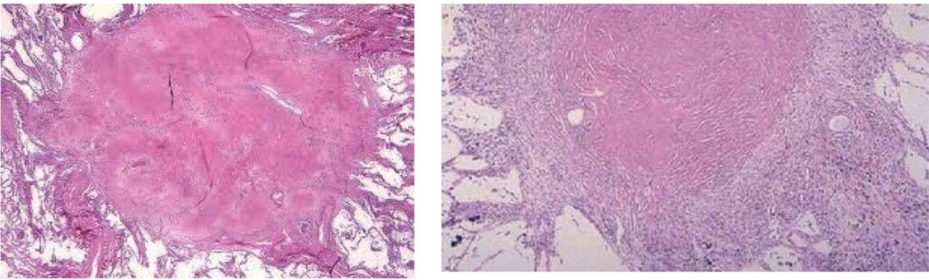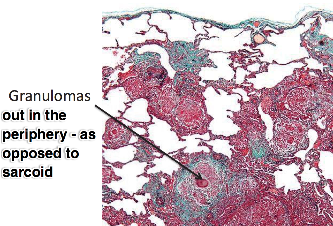 Non-caseating granulomas and interstitial thickening (fibrosis).