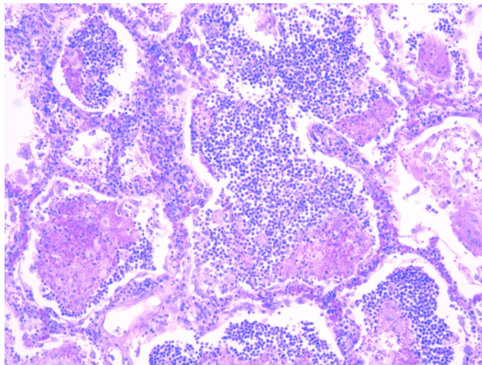Your patient is febrile and is experiencing shortness of breath and productive cough. They recently had a flu-like illness. The photo shows what their lungs would look like. What type of pneumonia is this?