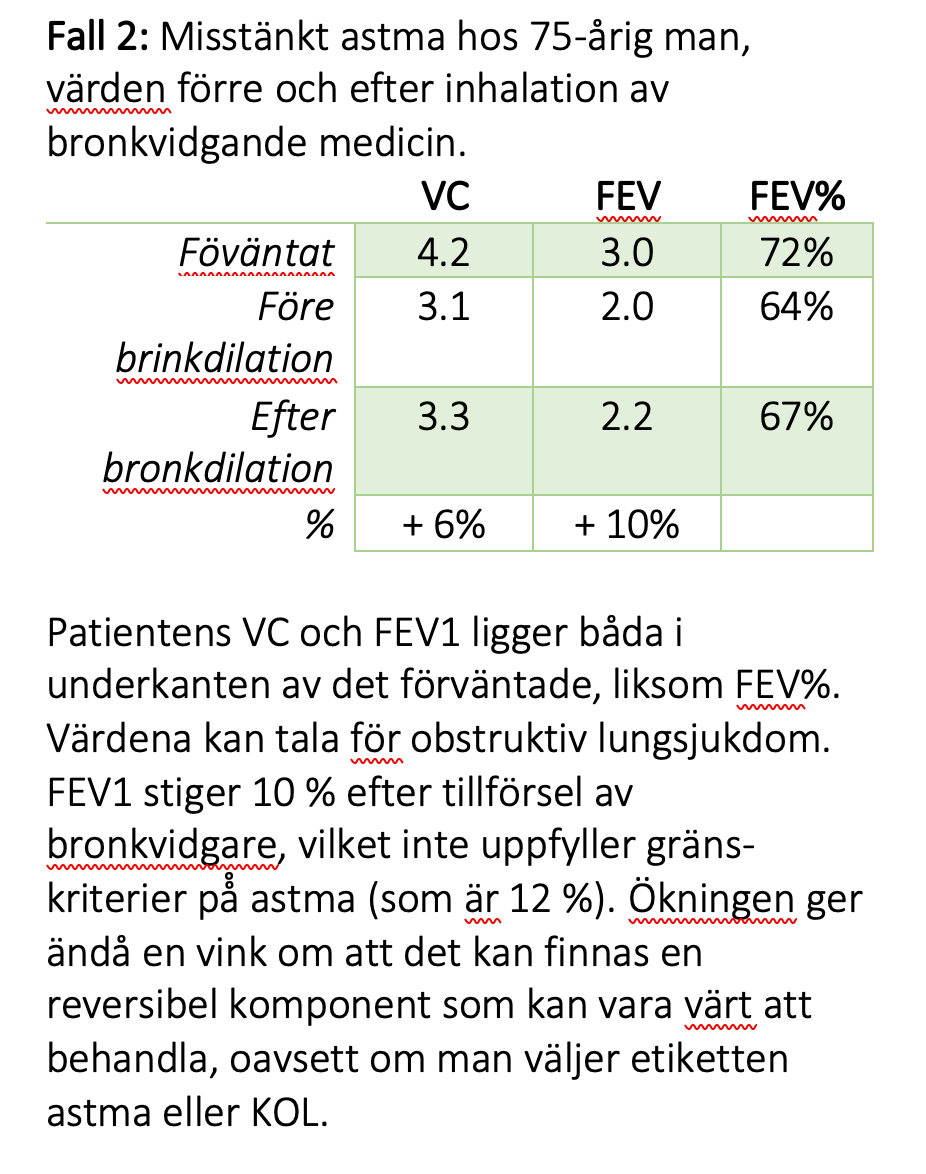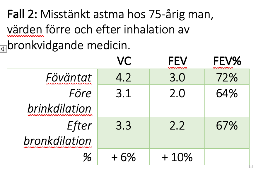 En ökning av FEV1 mer än 12% (minst 0,2 l) från utgångsvärdet bör tolkas som en signifikant farmakologisk effekt – en obstruktiv lungsjukdom ska då tolkas som astma. Oavsett % ökningen som ger en ökning indikation om att det är värt att behandla.