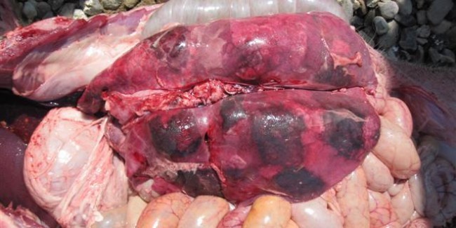 (Svin). Ofte lobær bronkopneumoni, sjældnere udseende som fokal pneumoni. Hyppigt i diafragmalap. Evt. disseminerede læsioner. Kendetegnet ved overgriben og fibrineksudation til overliggende pleura. Perakut ødematøse og hæmoragiske læsioner. Fibrinekssudation + nekrose.
