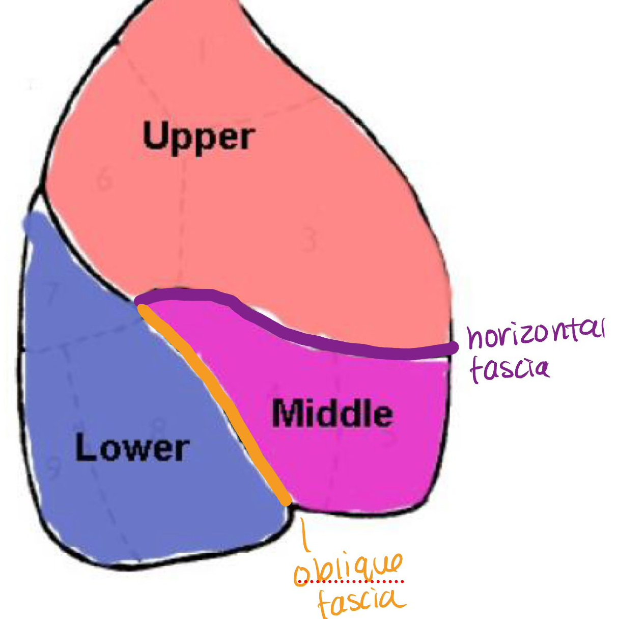 right (lateral) lung has how many lobes and fiscias?
