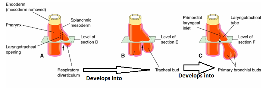 Its distal end (the tracheal portion) differentiates into the trachea starting at the 4th week. The position of this tube gives this bud its new name: respiratory (tracheal) bud. Its endodermal lining is comprised of epithelium and glands of the trachea and has overlying splachnic mesenchyme: cartilage, connective tissue, and muscles of the trachea.