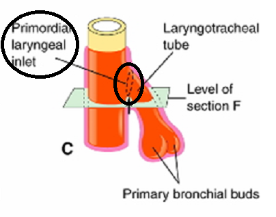 Forms at the end of the 4th week ventral to the caudal part of the foregut. Elongates and is invested with splanchnic mesenchyme. Its distal end enlarges to form the globular respiratory bud. Responsible for the tracheal bud, which goes on to develop into primary bronchial buds. Maintains communication with pharynx through primordial laryngeal inlet