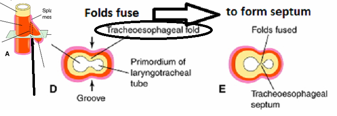 Divide gut tube into trachea and esophagus. Folds together to form full separation between trachea and esophagus. Develop in the posteroinferior aspect of the laryngotracheal diverticulum. Approach each other and fuse, becoming the tracheoesophageal septum