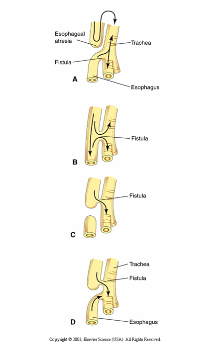 Abnormal presence of a connection between trachea and esophagus. If the tracheoesophageal septum does not form, there is a common tube between the trachea and esophagus allowing for fluids to get into lungs. BAD!