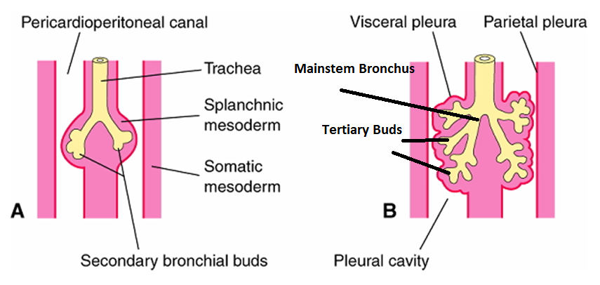 As the tracheal bud continues to grow inferiorly, the two primary bronchial buds are formed as twin outpouchings. Bronchial buds formed from endoderm grow laterally into the mesenchyme surrounding the pleuroperitoneal canals and primordia of the pleural cavities. Endodermal lining: epithelium and glands of bronchial branches. Overlying splanchnic mesencyme: cartilage, connective tissue, muscles of bronchi, and visceral pleura.