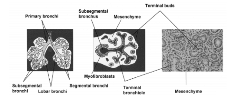 Weeks 6-16. During this time lung has distinctly glandular appearance created by small epitheal-lined tubules surrounded by abundant mesenchyme. By week 16, all bronchial airways have been formed. Further growth occurs by elongation and widening of existant airways; not by further branching.