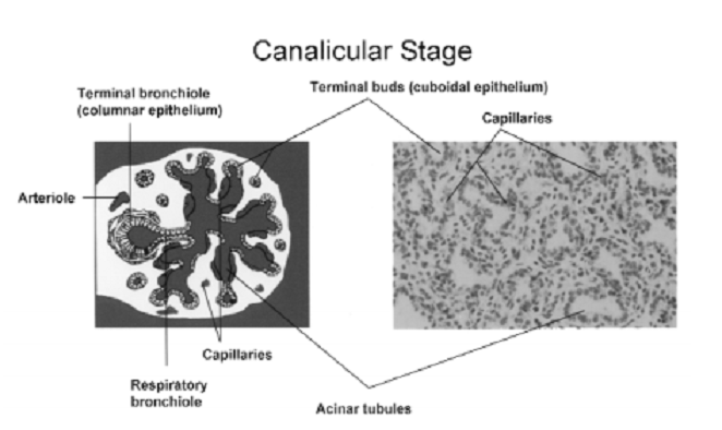 Weeks 16-26. Basic structure of gas-exchanging portion of lung is formed and vascularized. Lumina of the bronchi and terminal bronchioles enlarge and the lung tissue becomes highly vascular; respiration is possible at the end of this period because some thin-walled terminal saccules have developed at the ends of the respiratory bronchioles. A fetus born at the end of this period may survive if it receives intensive care