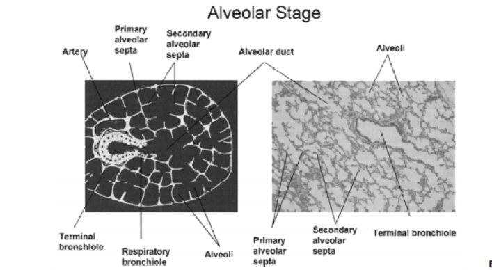 Pseudoglandular period (6-16 weeks), canalicular period (16-26 weeks), Terminal sac perior (26wks to birth), Alveolar period (32wks-8 years)