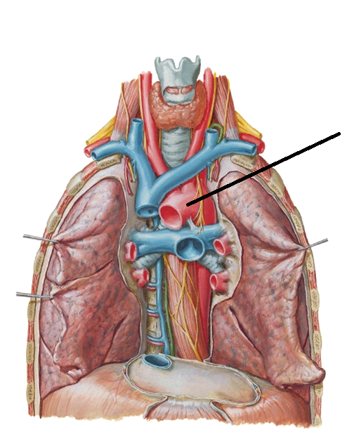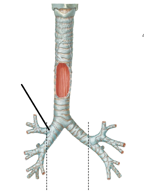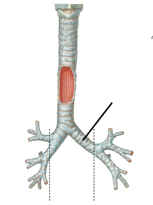 Wider, shorter, and more vertical than left primary bronchus. ~2.5 cm long. If a foreign body is aspirated, it’s likely going to be found in the right lung as a result of the shorter and more vertical path to the right lung.