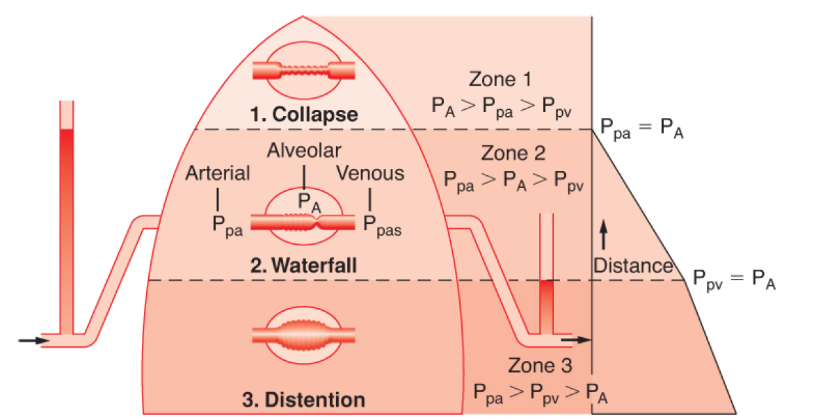 In Zone 1, alveolar pressure (PA) exceeds pulmonary artery pressure (Ppa), and no flow occurs because the vessels are collapsed.