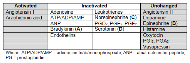 Dopamine, epinephrine (B), and histamine are not metabolized or removed from the pulmonary circulation since the pulmonary endothelium lacks an active transport mechanism for these hormones.