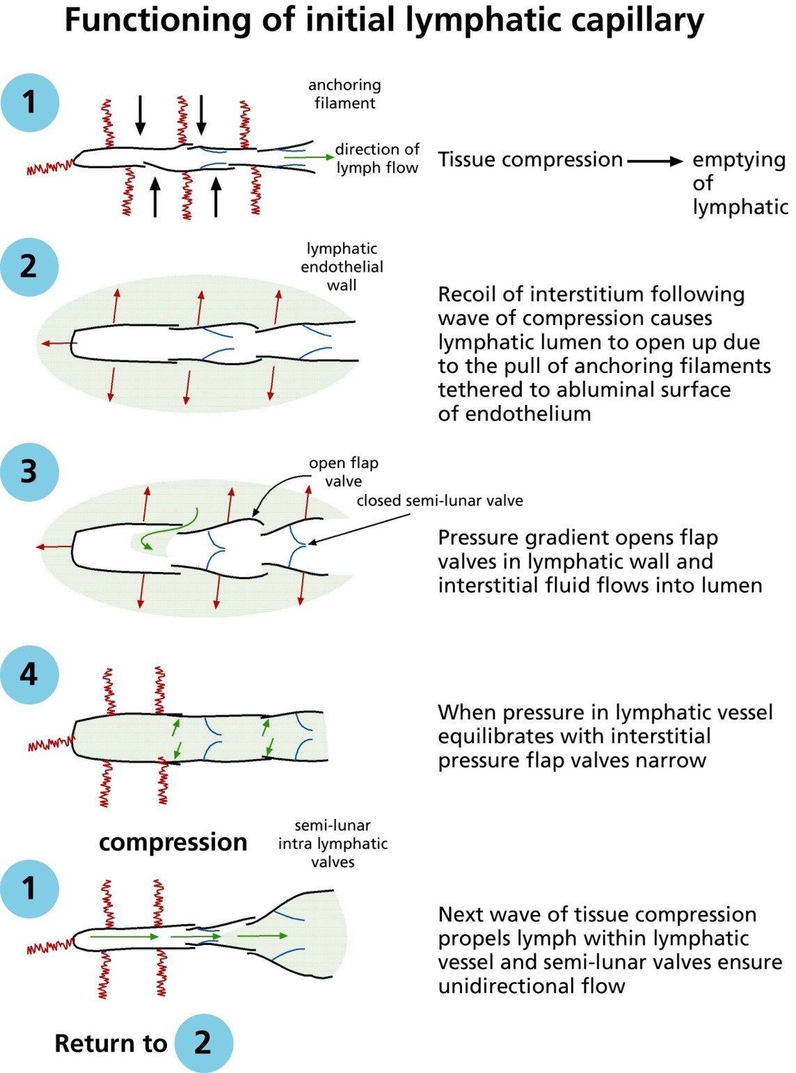 fluid flows through lymphatic -> equilibirum -> flat valves close and nothing happens until another pressure wave comes along and cycle repeats