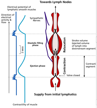 then filling point reached -> valve closes and muscle contracts, valve to next section opens and so lymph passes along towards lymph node