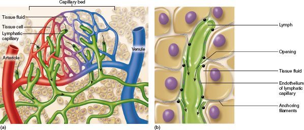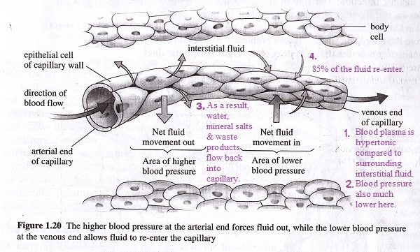 At the arterial end of the microvasculature, blood pressure and hypertonicity is higher than that of the tissue fluid, forcing fluid out of the capillary and into the surrounding tissue; however, at the venuous end of the microvasculature, blood pressure and hypertonicity is lower than that of the tissue fluid, forcing fluid into the capillary