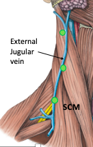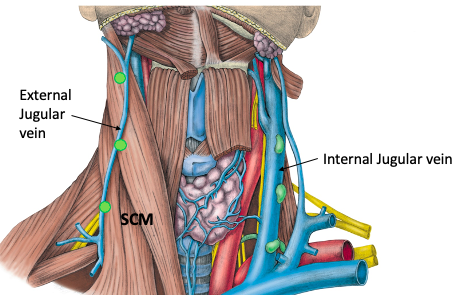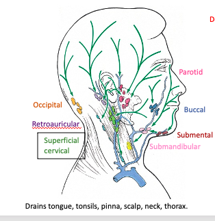Vessels enter superficial cervical lymph nodes along the course of the EJV (over SCM). Efferent vessels→ deep chain