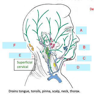Drain to the deep cervical lymph nodes: run down internal jugual vein