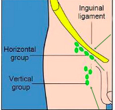 What are the two groups of inguinal lymph nodes and where are they located? [2]
