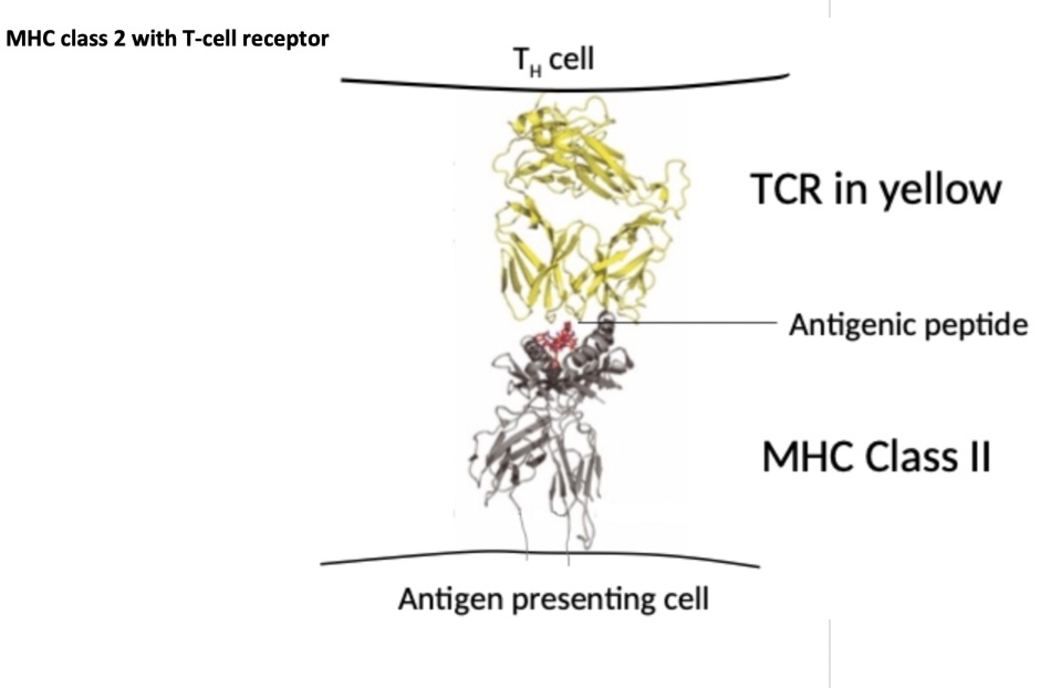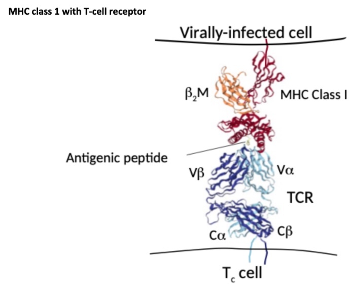 on T cell receptor the variable alpha and variable beta domains have 1 or 2 responsible for detecting antigenic peptide with MHC