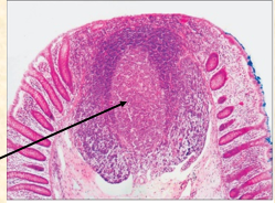 Peyers patch. Aggregations of lympoid tissue found associated with the mucosa in the small intestine. Germinal centre in this case. (MALT/GALT)