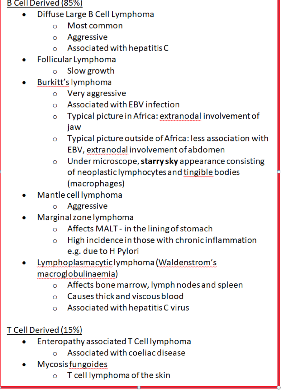 Non-Hodgkin’s : painless enlarging cervical lymph N + organ involvement (skin rashes, headache, hepatosplenomegaly + sore throat/ cough + BM fail signs) – associated with Sjogrens