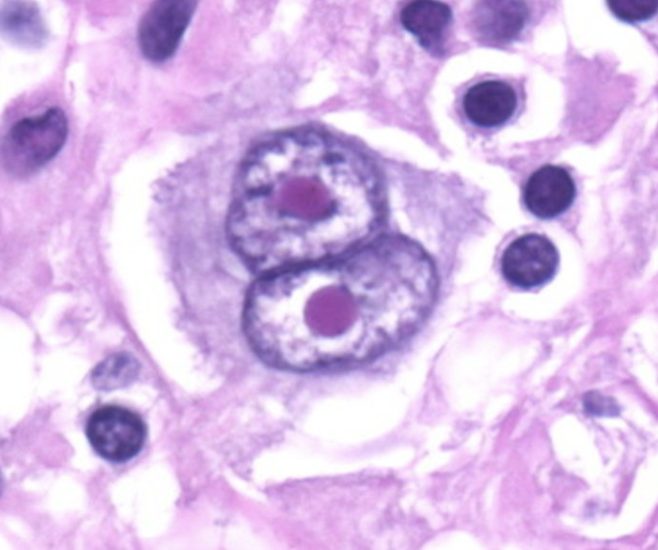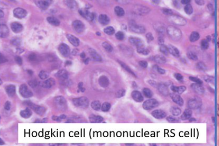 Cell: Reed- Sternberg cell –> Large binucleaed or polylobaed cells with large nucleoli (malignant B-cells)