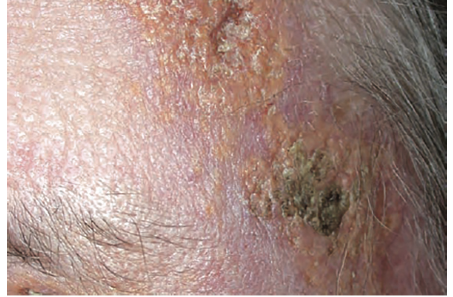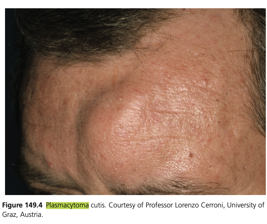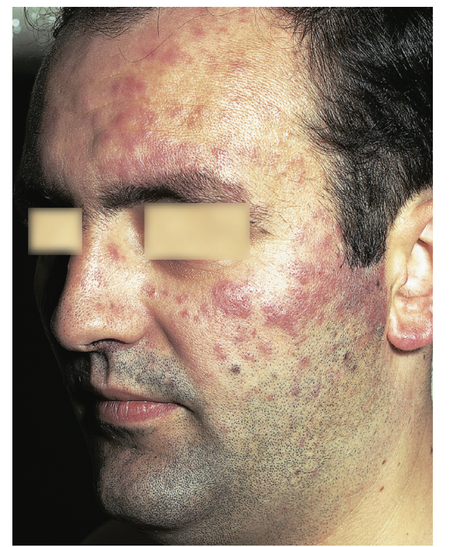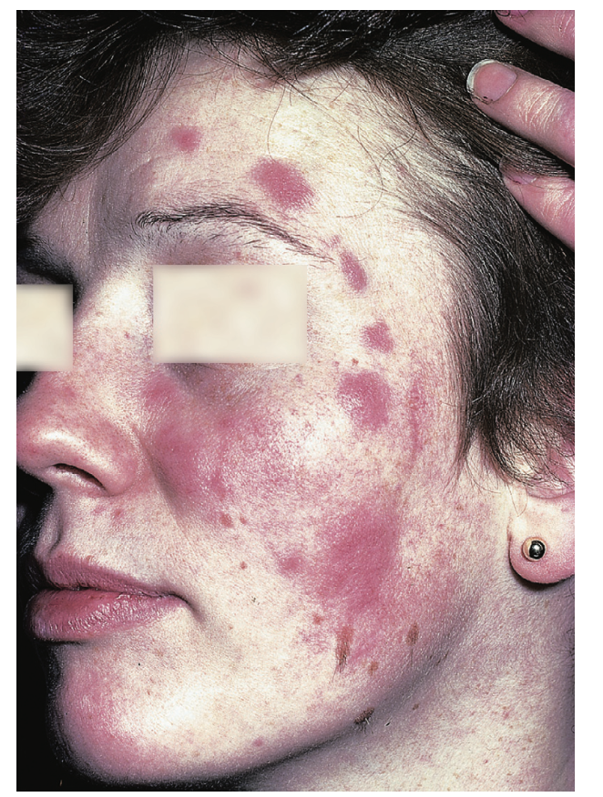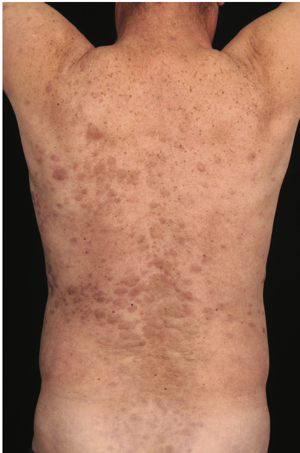 plum-coloured papules, nodules or plaques, most commonly on the face, chest and upper extremities. Occasionally,
