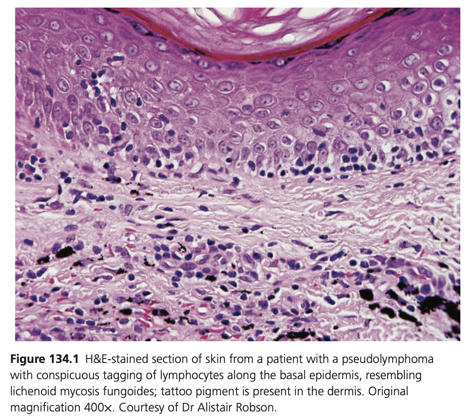 The most important differential diagnosis is of cutaneous B- and T-cell lymphoma. Careful clinicopathological correlation is vital in order to distinguish between them. Primary cutaneous CD4+ small/medium-sized pleomorphic T-cell lymphoproliferative disorder is an increasingly recognised entity that may have very similar clinical and histological features to pseudolymphoma and has an indolent behaviour.