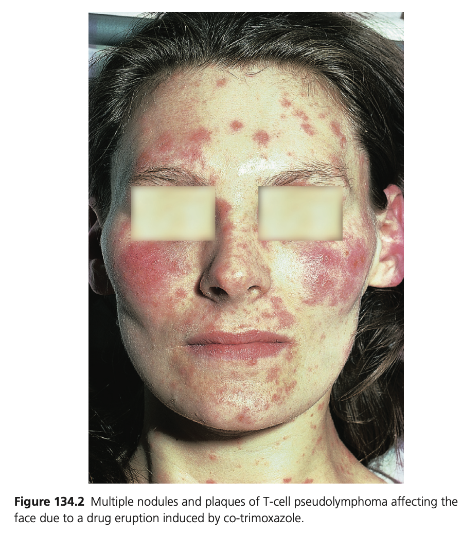 pseudolymphoma, full blood count (FBC) and liver function tests should be checked as eosinophilia and hepatitis may occur.