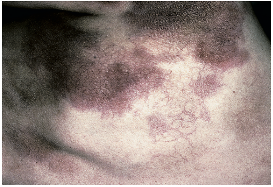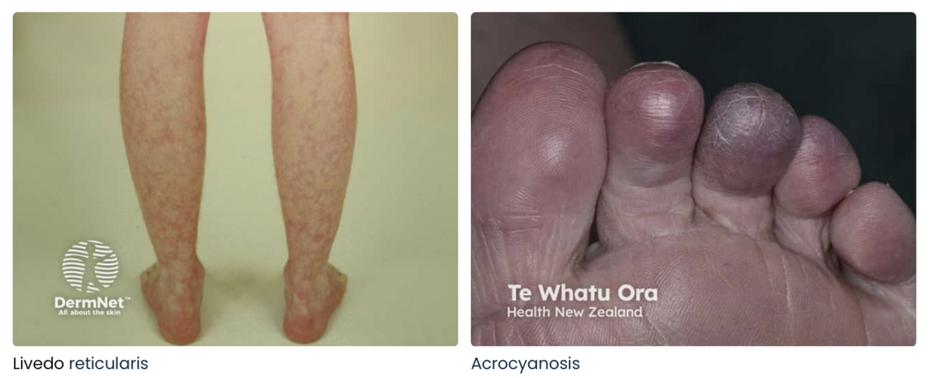 Livedo reticularis (purplish lace-like discolouration)