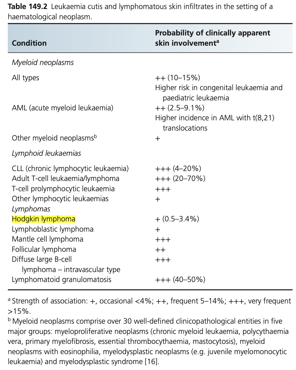 In Hodgkin disease, specific skin involvement is uncommon, with an estimated prevalence of 0.5–3.4%.