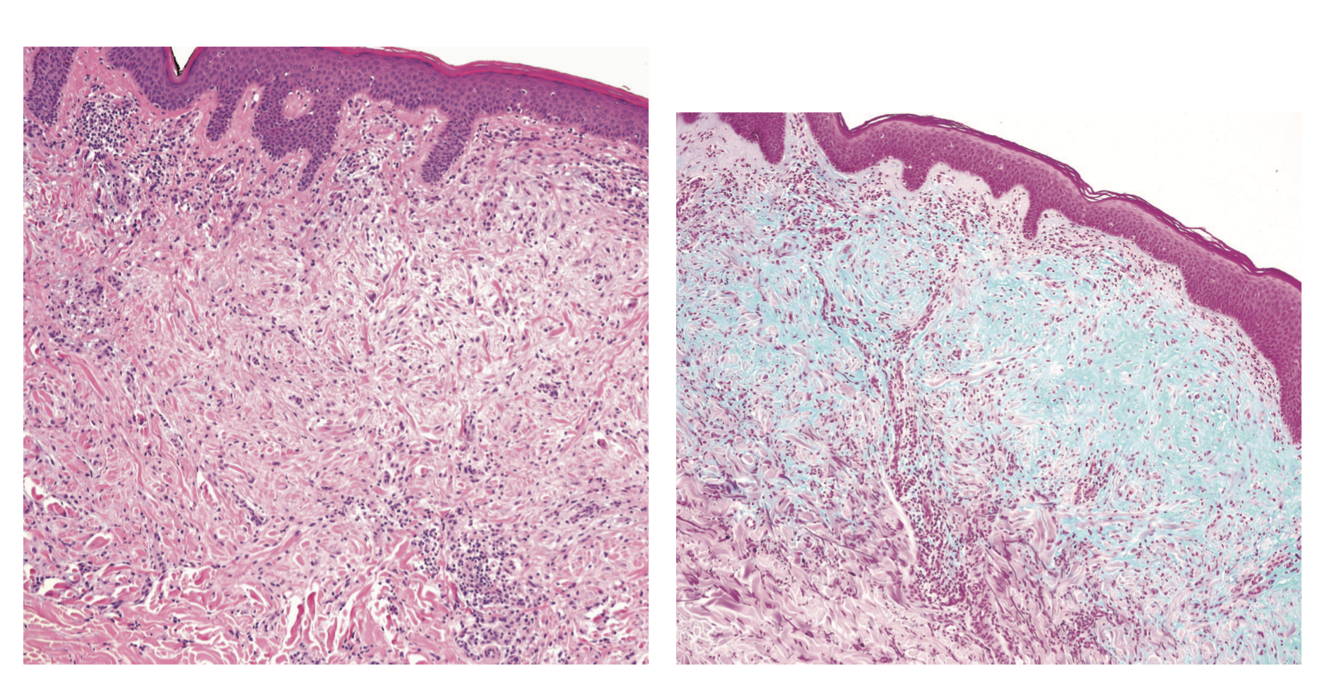 stain and hyaluronidase digestion (ii) an increase in collagen deposition; and (iii) a proliferation of irregularly arranged fibroblasts. The epidermis may be normal or thinned, the hair follicles may be atrophic and a slight perivascular superficial lymphoplasmacytic infiltrate is often present. The elastic fibres are fragmented and decreased in number.