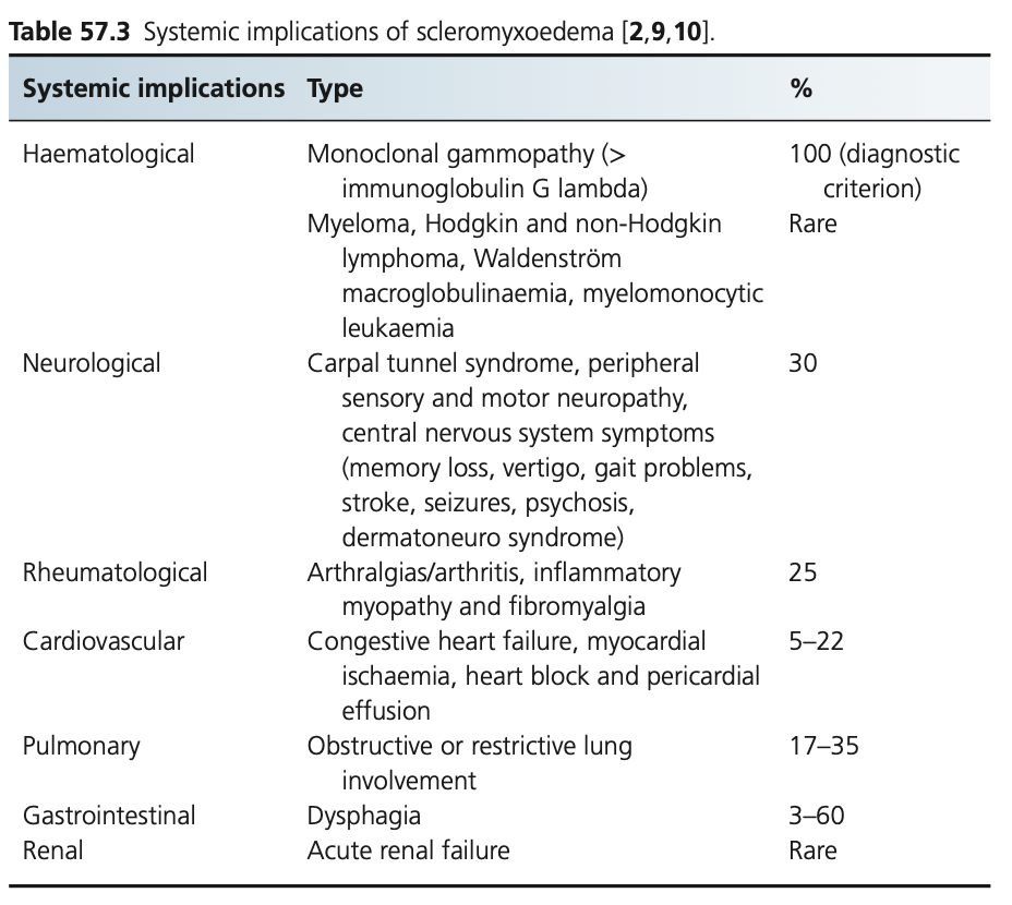 Over the last 30 years, there has been a progressive improvement in the mortality of scleromyxoedema patients decreasing from 35% in 1995, to 23.8% in 2013, and to 3% in a 2020 study that has been partially attributed to the influence of therapy, especially the use of intravenous immunoglobulin.