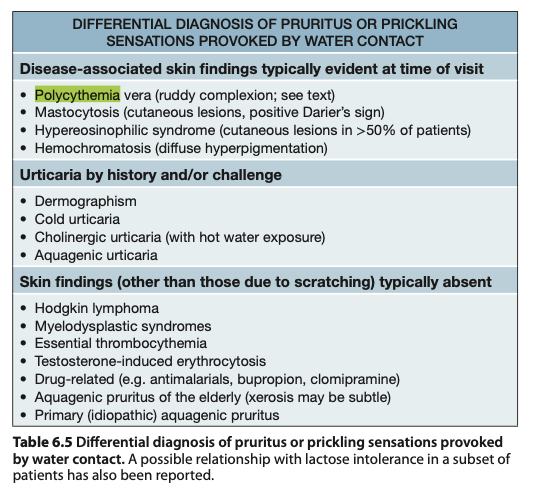 Aquagenic pruritus may precede the development of polycythemia vera by several years and eventually affects ~30%–50% of polycythemia vera patients. Thus, this diagnosis should be considered in all patients with aquagenic pruritus. Additional cutaneous findings include a
