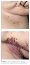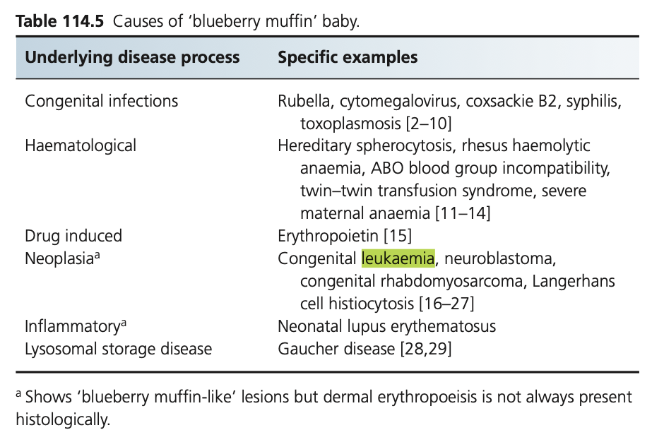 Prolonged dermal extramedullary haematopoiesis can also occur in neonates without a haematological neoplasm but as a reactive phenomenon to an infection commencing in utero, such as one of the TORCH group of infections (toxoplasmosis, other (e.g. syphilis, varicella-zoster, parvovirusB19) ,rubella, cytomegalovirus and herpes infections). The generalised haemorrhagic, purpuric eruption that ensues has led to the term ‘blueberry muffin baby’. In children and adults, reactive extramedullary haematopoiesis may also
