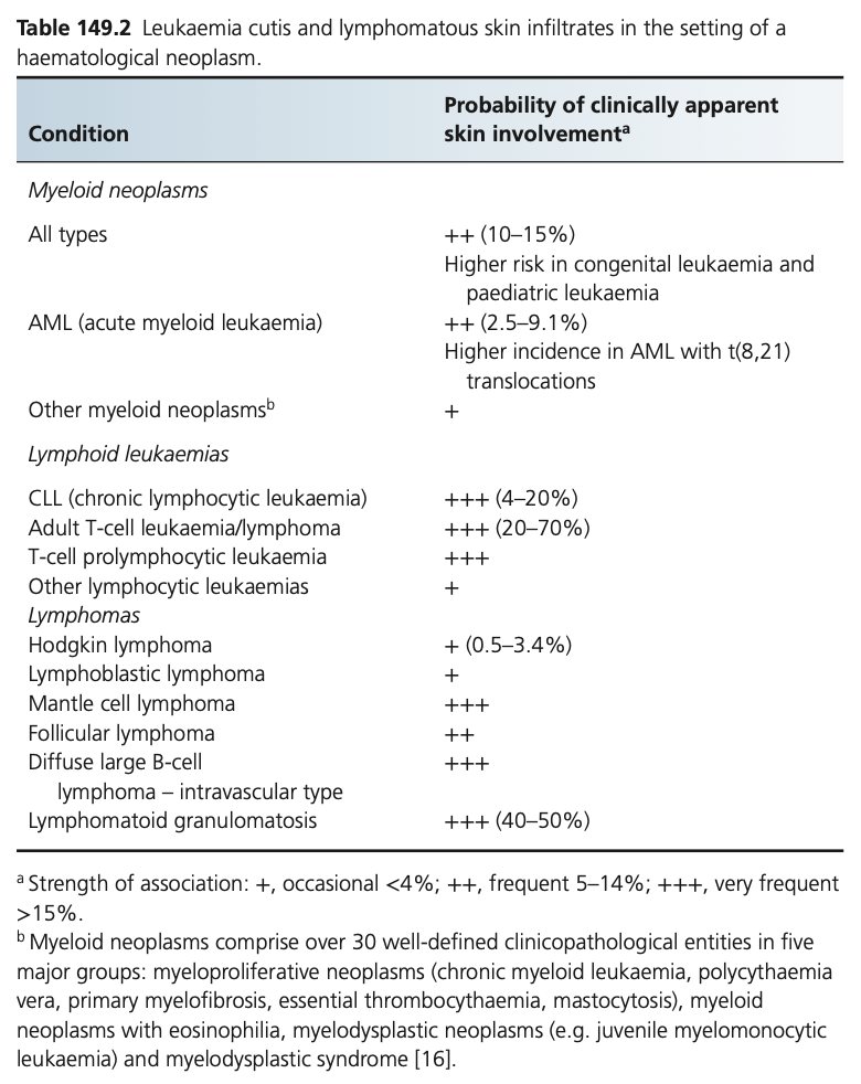 Skin lesions mostly develop after or concurrently with the diagnosis of a myeloid disorder (60% and 25%, respectively) and only in approximately 5% of cases do they develop before any detectable bone marrow or blood involvement as an aleukaemic leukaemia cutis.