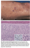reddish or violaceous/grey-blue macules, papules or nodules,