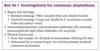 A skin biopsy is needed for histology, immunohistochemistry and immunoglobulin gene analysis. Serology is required to test for Borrelia burgdorferi. Patch testing may be requested if a possible contact allergen is suspected.