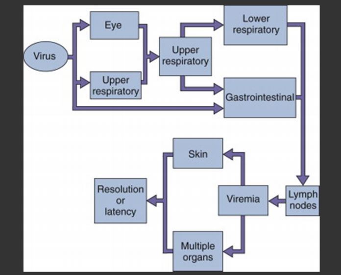 Virus passes into Gastro-associated lymph tissues, then to local lymph nodes and then to the blood stream via lymphatic system