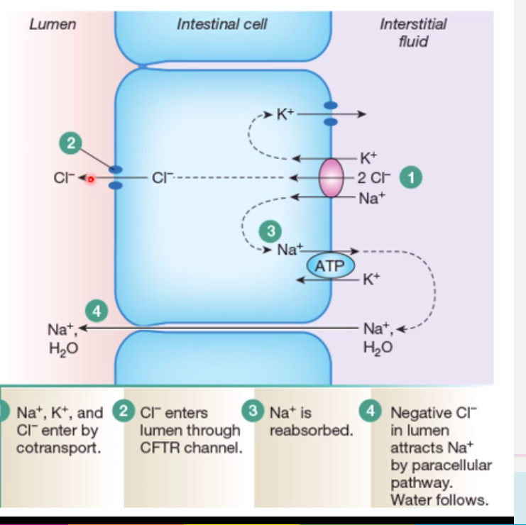 d) negative Cl- in lumen attracts Na by paracellular pathway (through cell gaps)