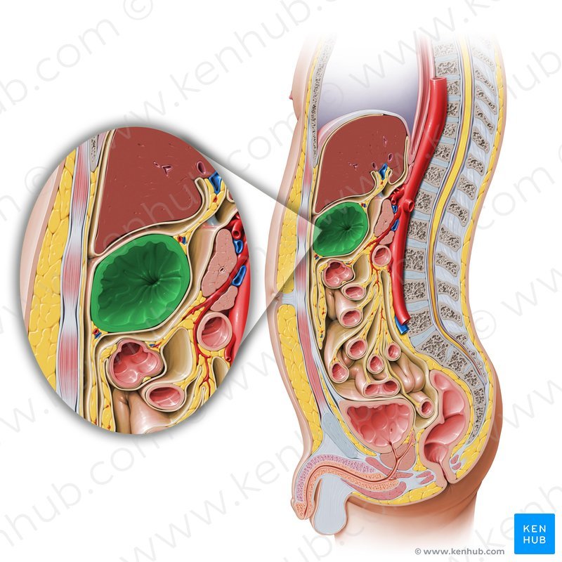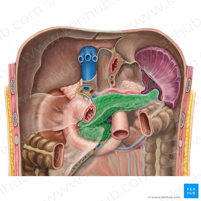 It secretes pancreatic juice into the duodenum, contains bicarbonate, which neutralizes the acid.