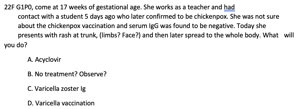 A (pregnant and rash confirmed VZV –> isolation with airborne precaution, oral or IV acyclovir + delay IOL/elective delivery x 7d)