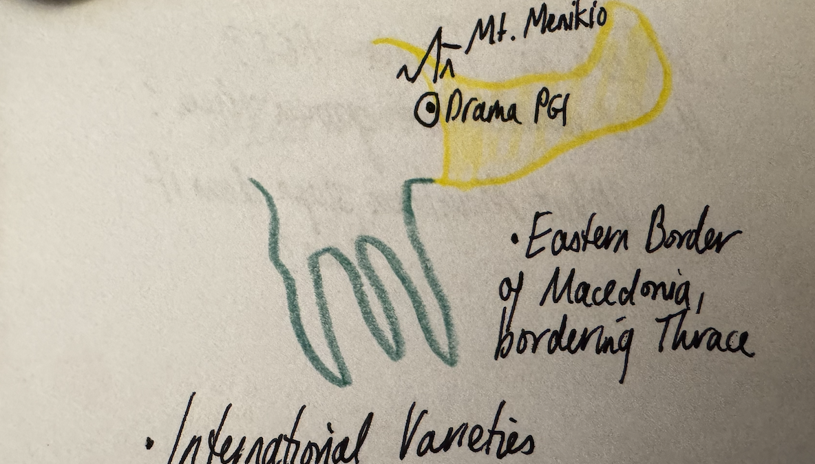 Where is Drama PGI? What varieties are grown there? What mountain slope does it hug?