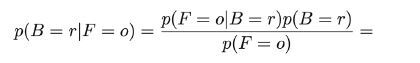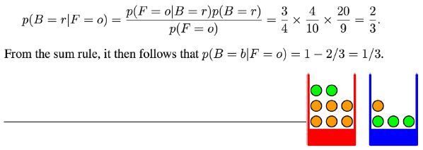 Now suppose we pick a box at random, and it turns out to be a red box. Then the probability of selecting an orange is just the fraction of oranges in the red box, is π(πΉ=π|π΅=π)=