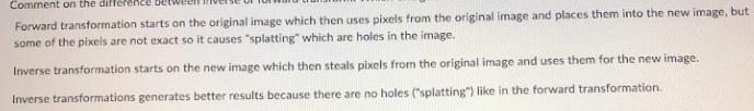 To perform affine and perspective transformations, we can use inverse and forward transform. Comment on the differences between inverse and forward transform. Which one generates better output images? Shortly explain your reasons.